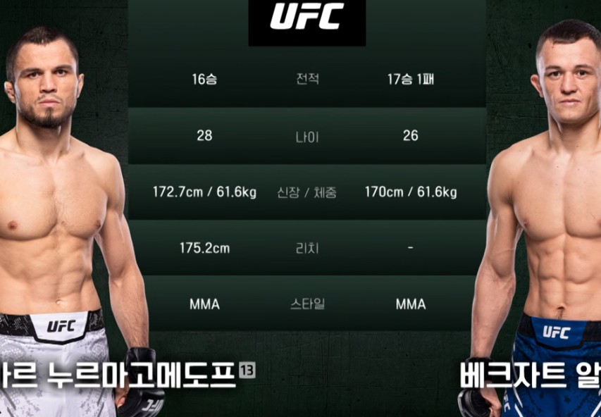 안녕하세요, 독수리 정수리입니다. 오늘은 우르마 누르마고메도프 선수와 베크자트 알마한 선수의 ufn 경기 리뷰를 해보겠습니다. 우르마 누르마고메도프 선수는 현재는 은퇴한 전 라이트급 챔프 하빕 누르마고메도프의 사촌 동생이라고 합니다. 하빕과 달리 우르마는 킥이 좋고, 무에타이 베이스에 레슬링이 장착된 강력한 파이터로 현재 랭킹은 밴텀급 13위지만, 향후 밴텀급 챔프로 올라갈 수 있는 가능성이 상당히 높은 파이터입니다. 현재 18전 18승 무패를 달리고 있습니다!(베크자트를 잡은 기록까지) 러시아 다게스탄 파이터들의 전성기라 봐도 무방하겠습니다.. 하빕, 이슬람 마카체프부터.. 비공식 챔프라고 불릴 만큼 파이터들이 우르마 선수와 붙는 걸 굉장히 꺼린다고 합니다. 그에 ufc 데뷔전을 갖는 베크자트 선수가 ..